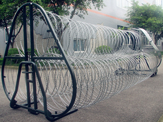 阻隔網(wǎng)(防暴阻隔網(wǎng))主要由動支架、定支架、刀片網(wǎng)、回收裝置組件等四部分組成。