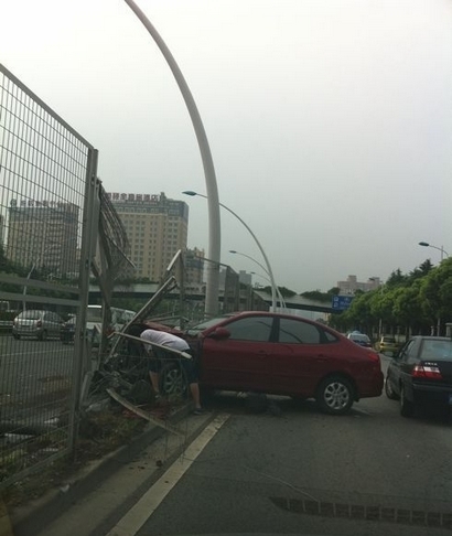 目擊者陳先生稱,事發(fā)時,這輛紅色北京現(xiàn)代轎車正沿中環(huán)外圈行駛,在吳中路出口預(yù)備駛離中環(huán)?!爸宦牎Z’的一聲,整個車頭都撞在了護欄網(wǎng)上?!?/p>